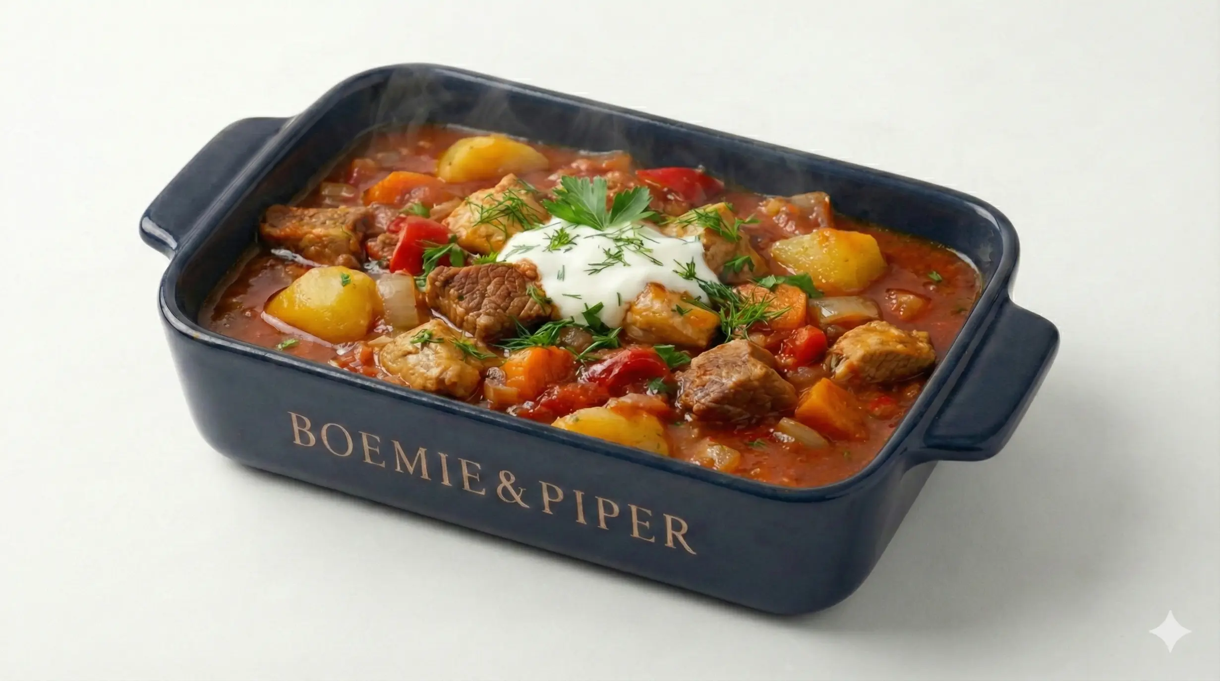 Carne de vită, ceapă, morcovi, ardei, cartofi, pastă de roșii, usturoi, ulei, boia dulce, chimen, sare, piper, foi de dafin.