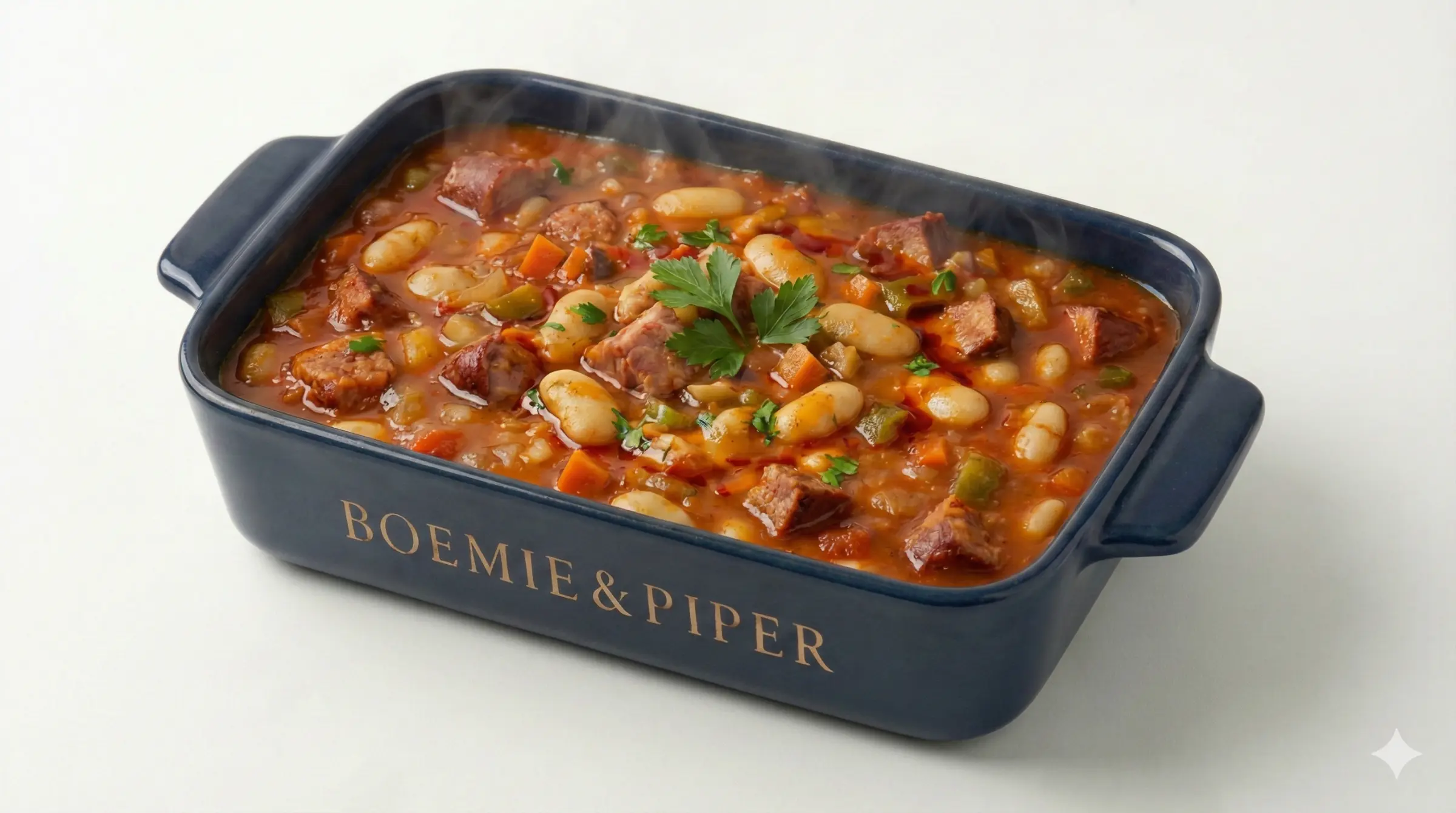 Fasole boabe, ceapă, morcovi, ardei, pastă de roșii, usturoi, ulei, sare, piper, foi de dafin, cimbru, apă.