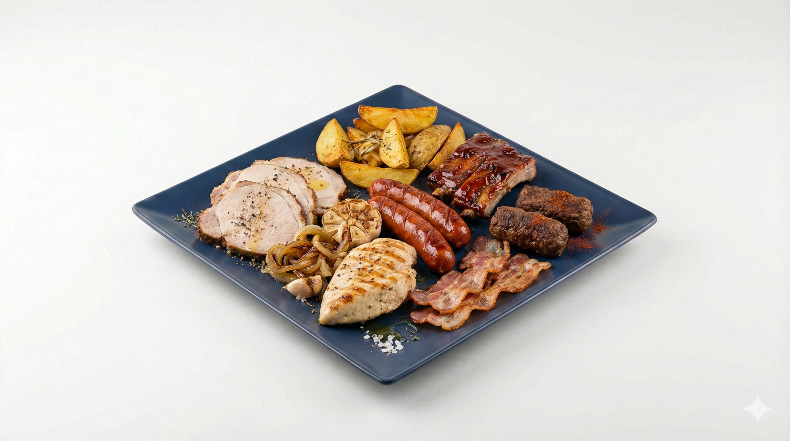 Friptură de porc, piept de pui la grătar, cârnați afumați, coaste de porc, mici, bacon, cartofi copți sau prăjiți, ceapă, usturoi, sare, piper, condimente (boia, cimbru), ulei.