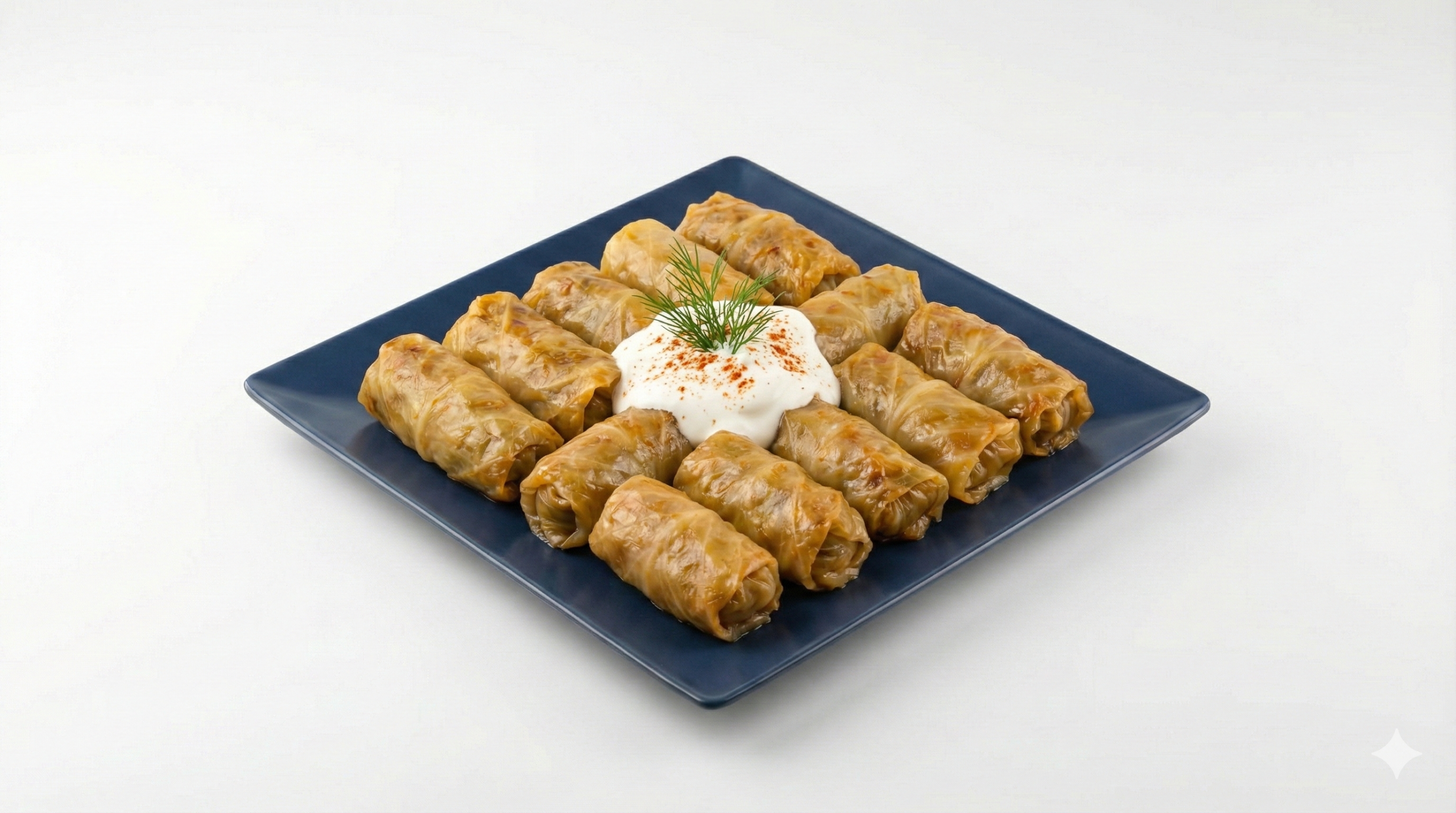 Carne tocată de porc, orez, varză murată, ceapă, morcovi, pastă de roșii, ulei, sare, piper, cimbru, foi de dafin.